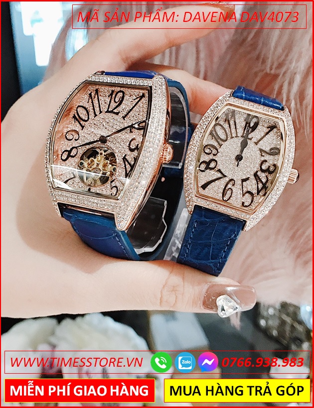 Đồng Hồ Cặp Đôi Davena Automatic Full Đá Dây Da Xanh