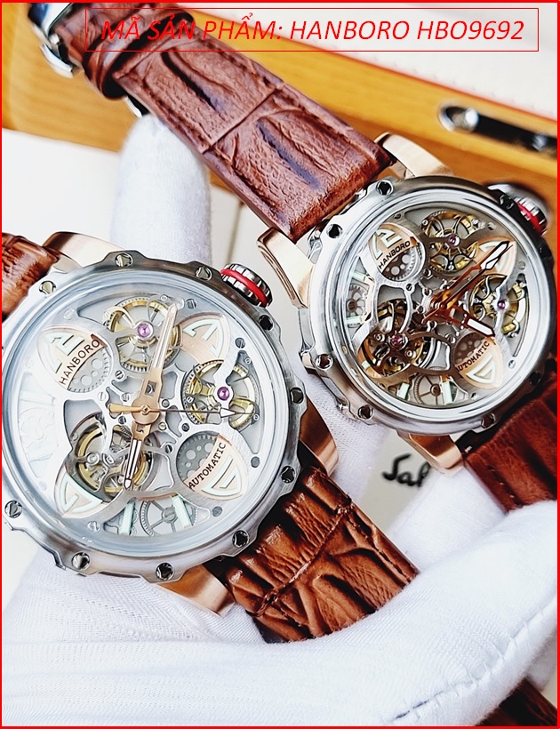 Đồng Hồ Cặp Đôi Hanboro Tourbillon Automatic Demi Lộ Máy Dây Da Nâu