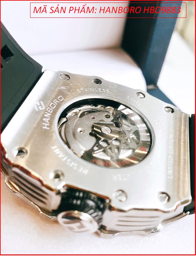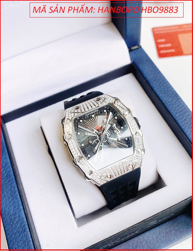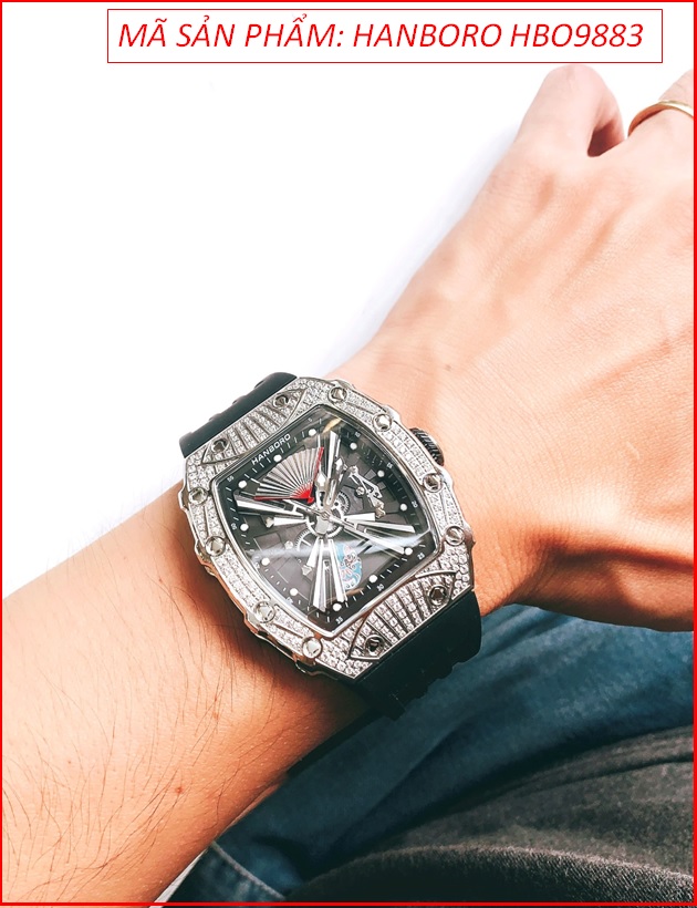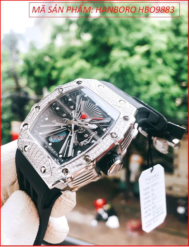 Đồng Hồ Nam Hanboro Automatic Đính Đá Lật Mặt Dây Silicone