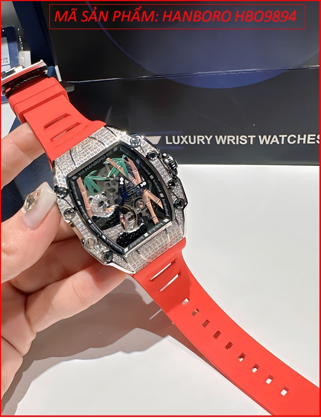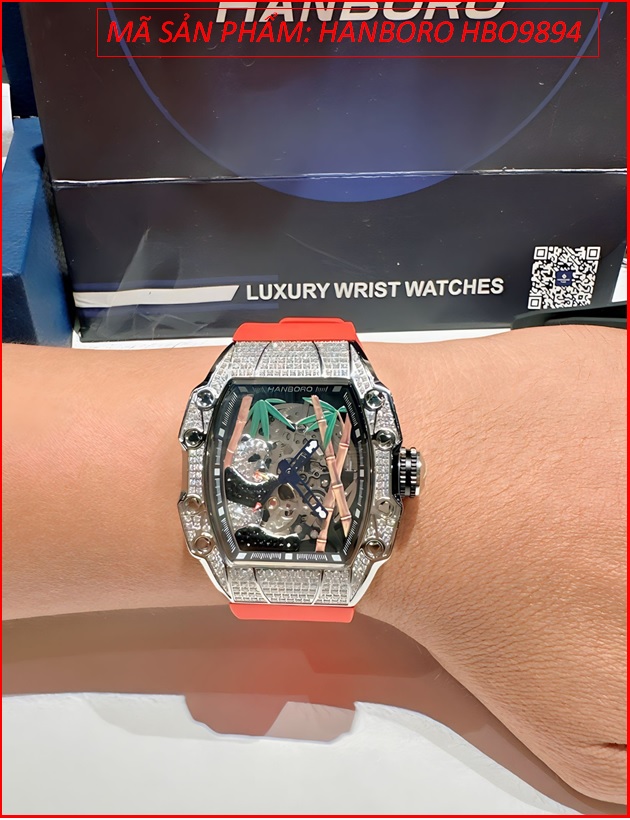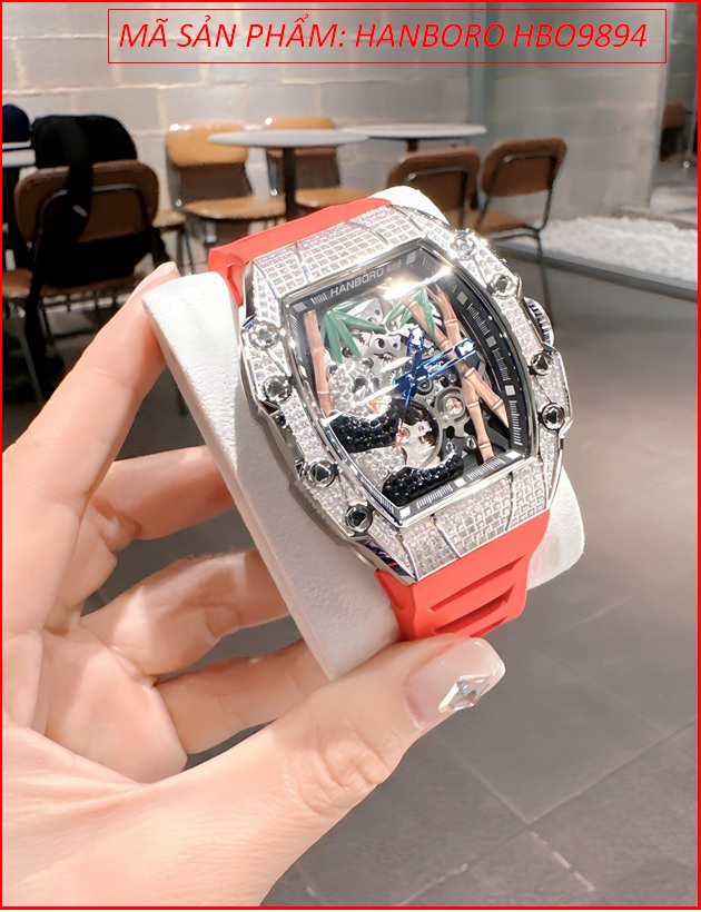 Đồng Hồ Nam Hanboro Automatic Họa Tiết Gấu Trúc Đính Đá Silicone Đỏ