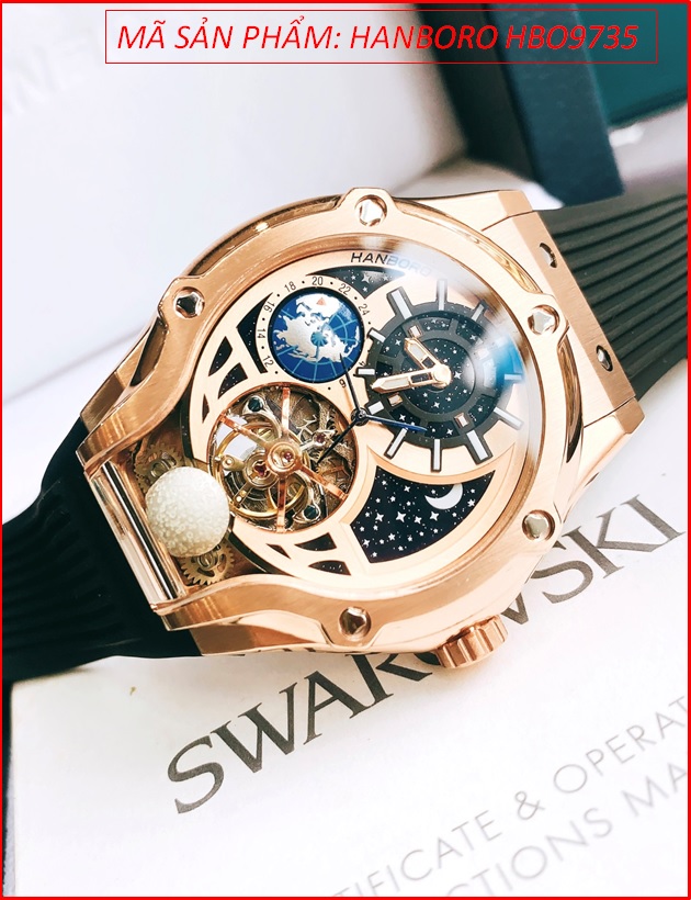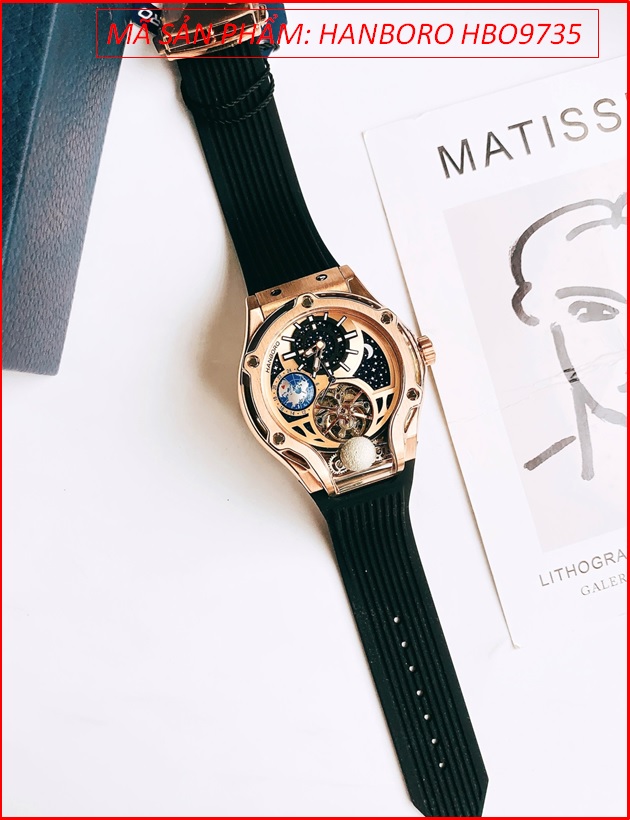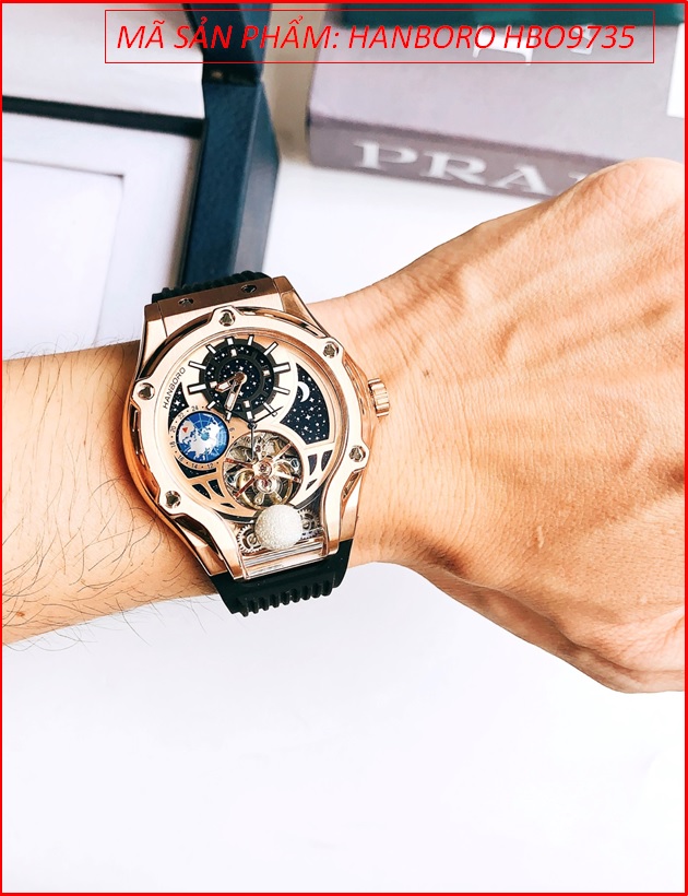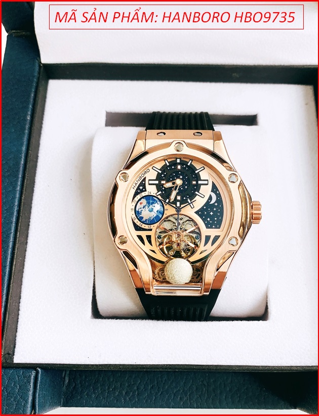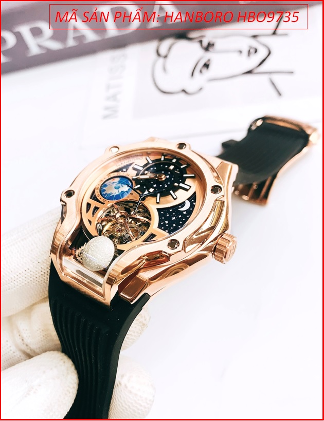 Đồng Hồ Nam Hanboro Automatic Lộ Cơ Mặt Rose Gold Dây Silicone