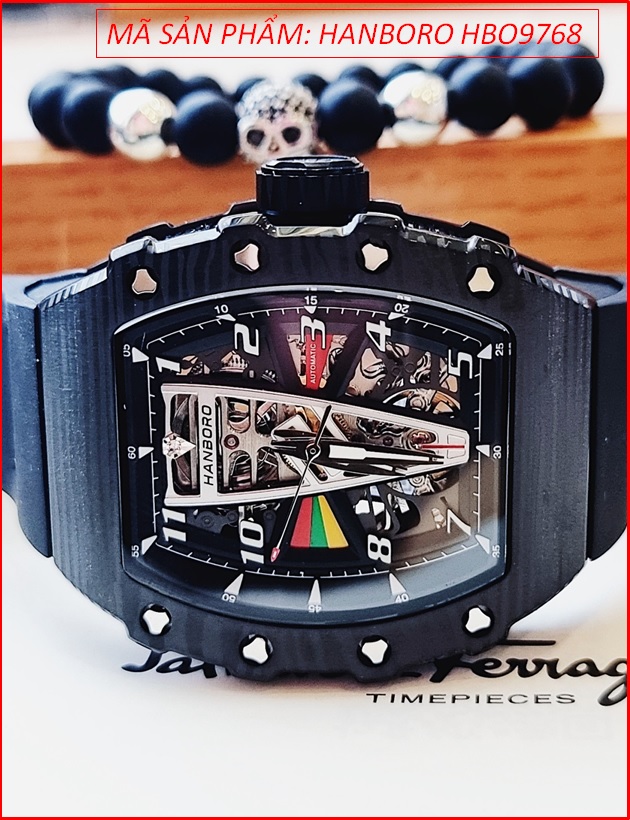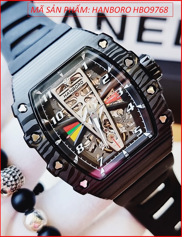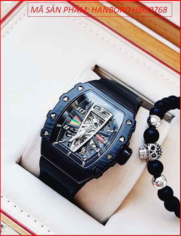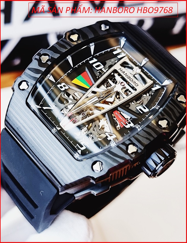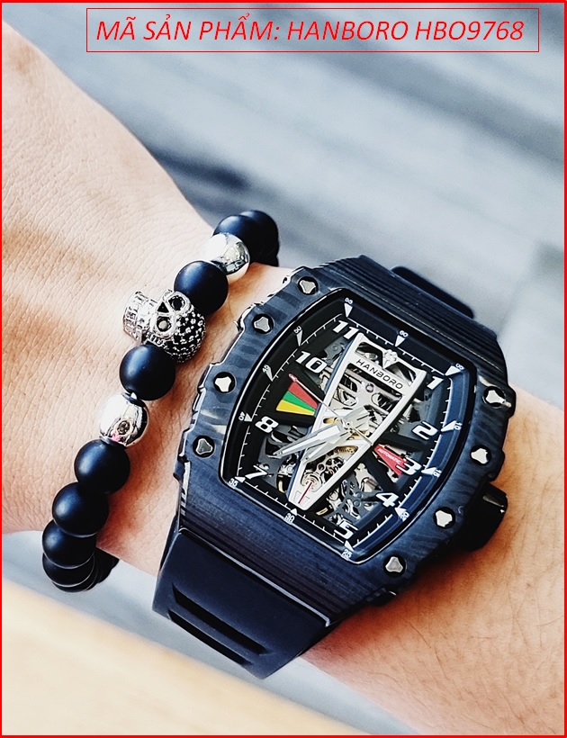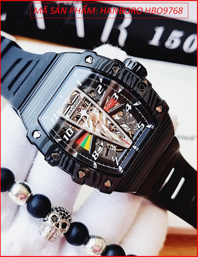 Đồng Hồ Nam Hanboro Automatic Mặt Full Đen Lộ Cơ Dây Silicone