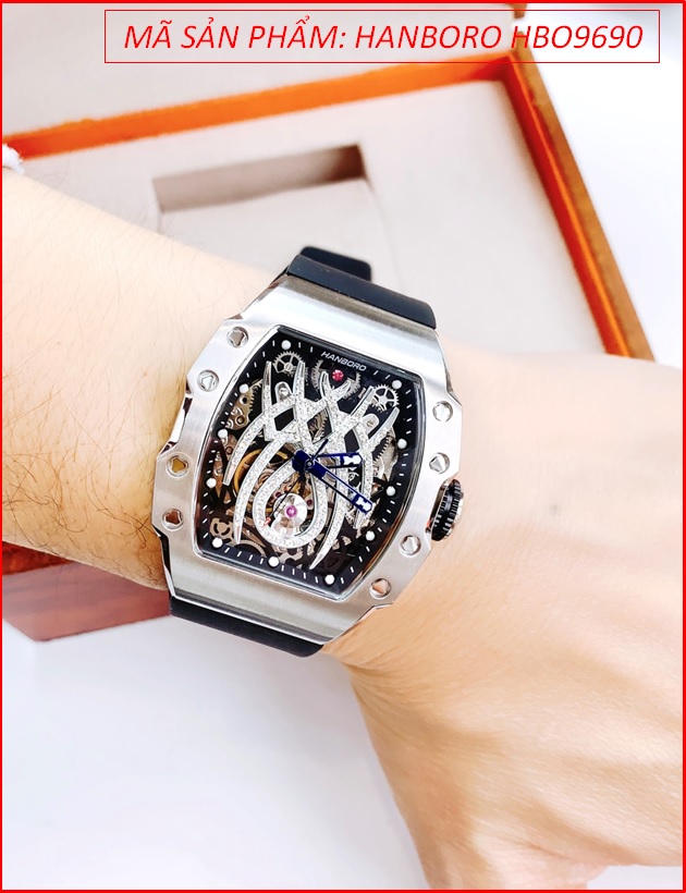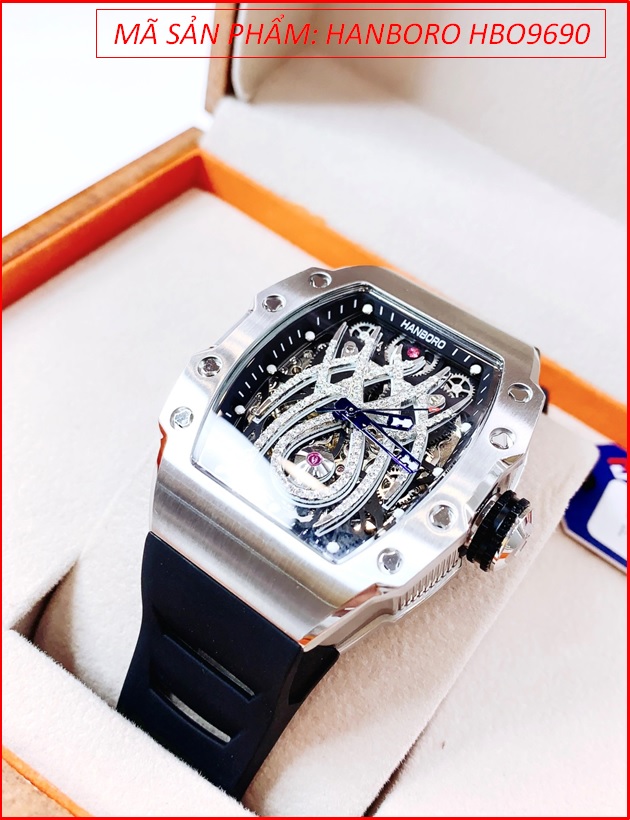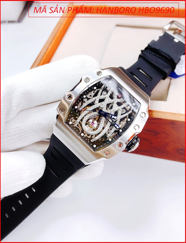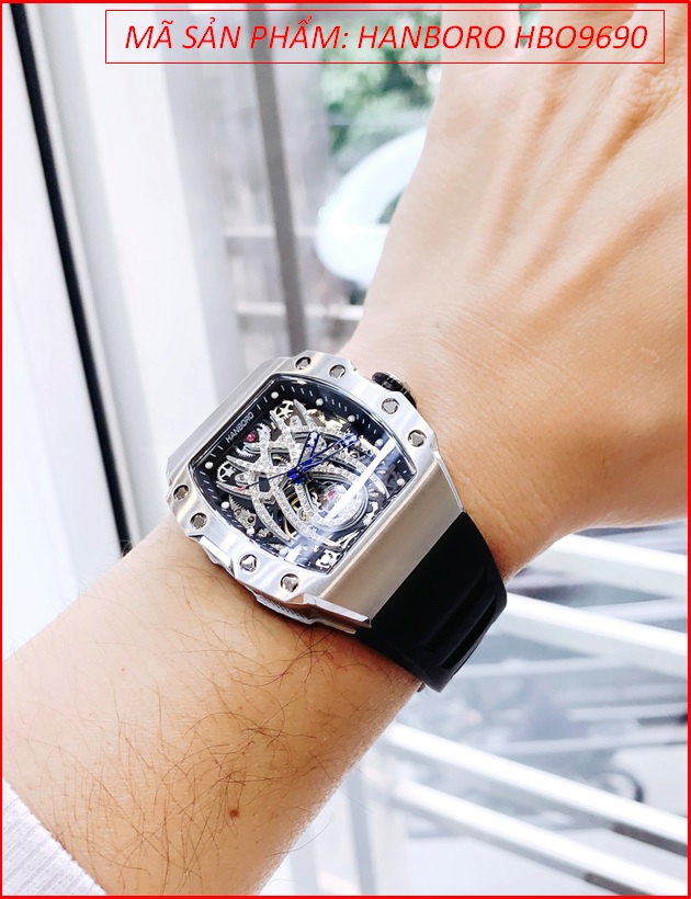 Đồng Hồ Nam Hanboro Automatic Mặt Nhện Silver Dây Silicone Đen