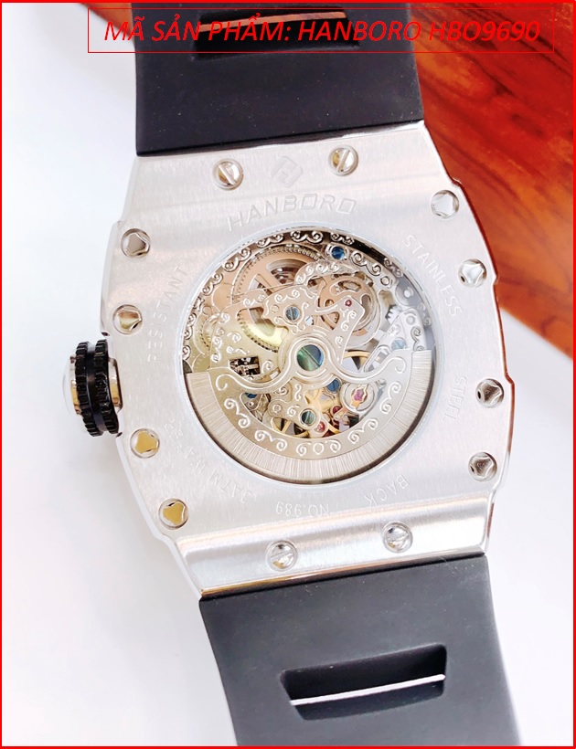 Đồng Hồ Nam Hanboro Automatic Mặt Nhện Silver Dây Silicone Đen (40x50mm)