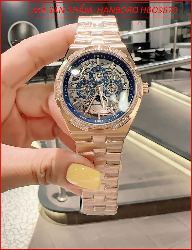 Đồng Hồ Nam Hanboro Automatic Mặt Xanh Lộ Máy Dây Rose Gold