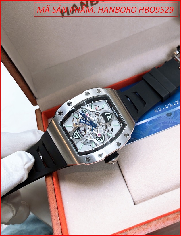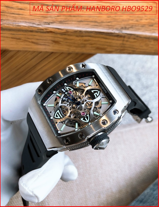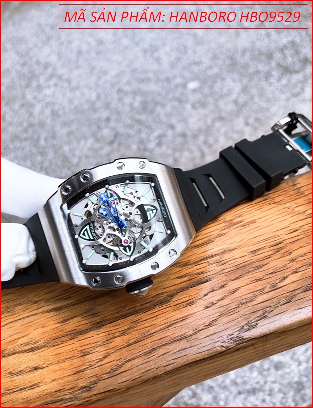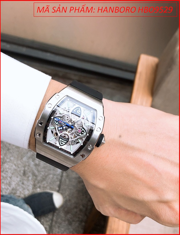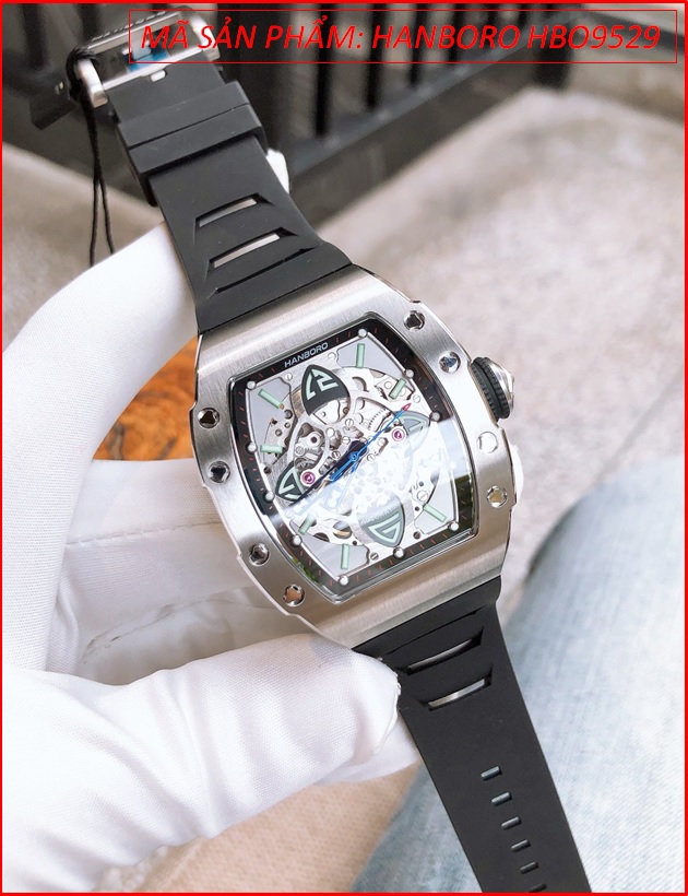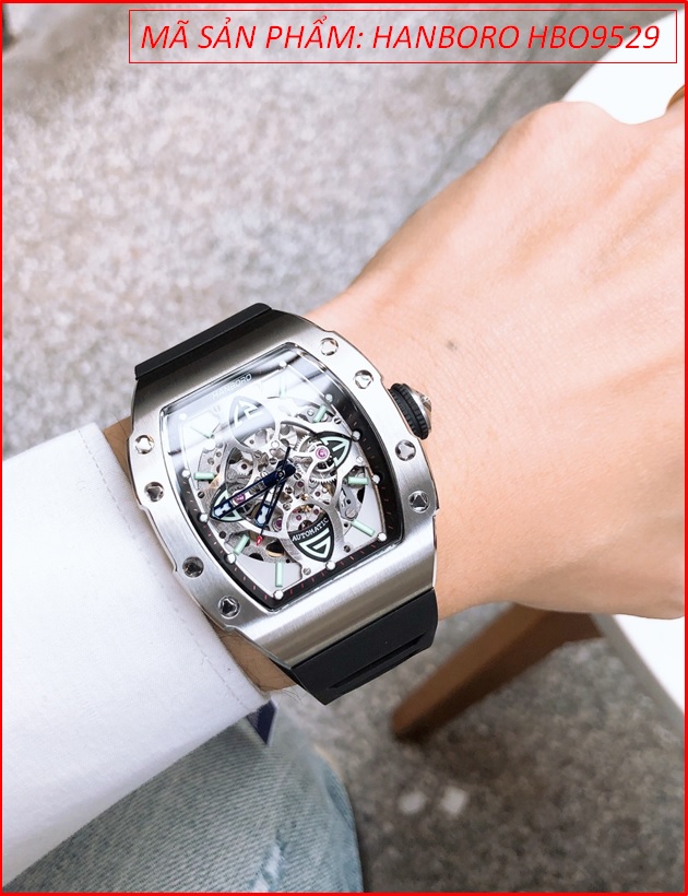 Đồng hồ Nam Hanboro Mặt Oval Automatic Lộ Máy Silver Dây Cao Su