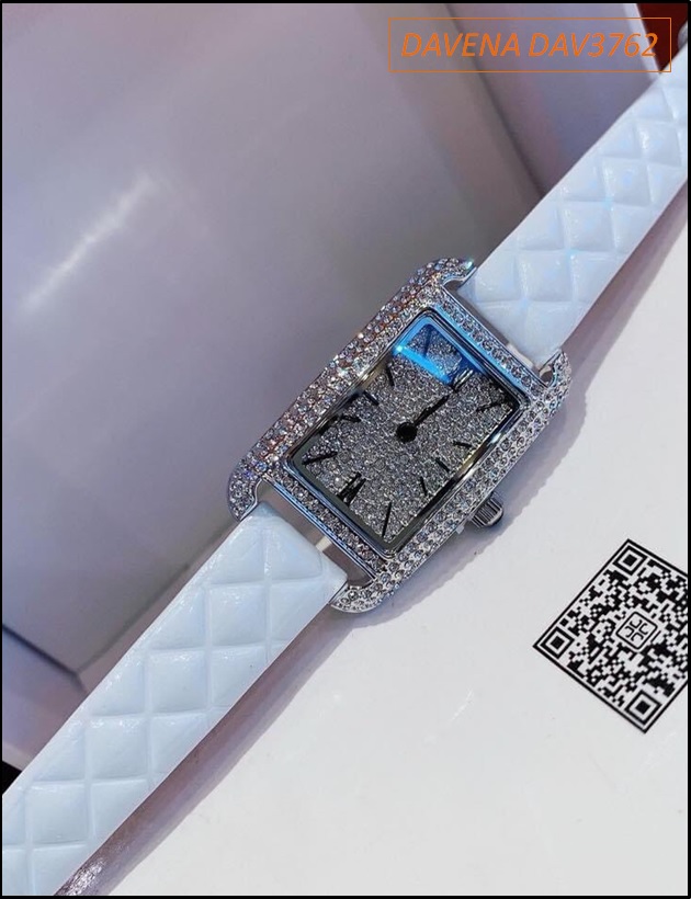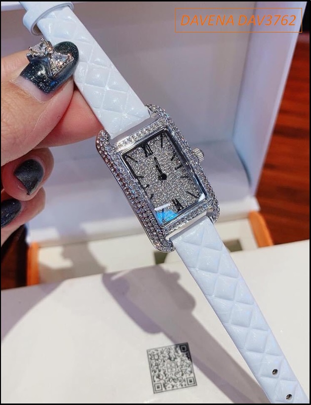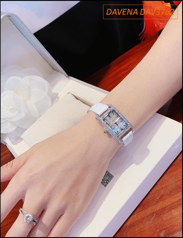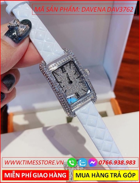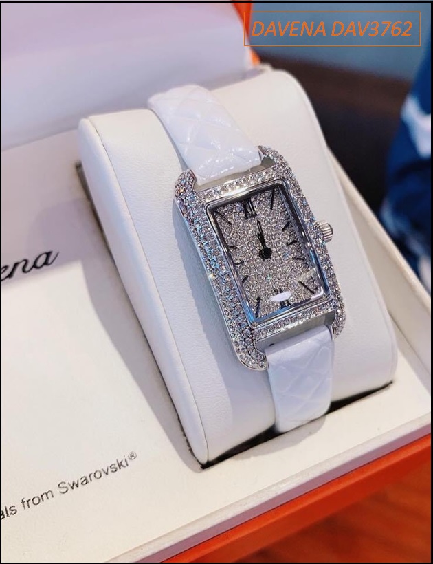 Đồng hồ Nữ Davena Mặt Chữ Nhật Dây Da Trắng Swarovski Silver