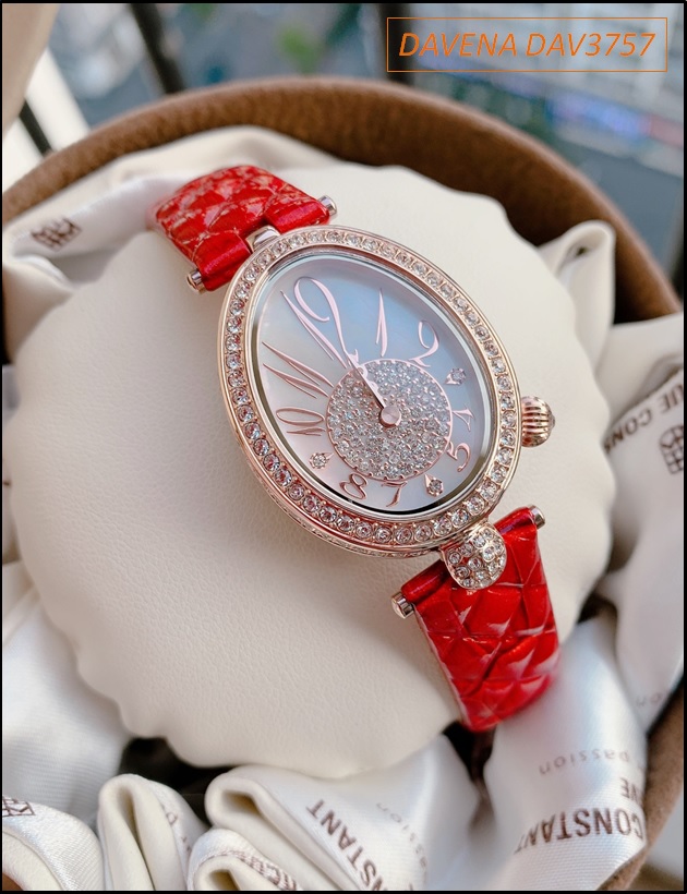 Đồng hồ Nữ Davena Mặt Elip Dây da Đỏ Đá Swarovski Rose Gold