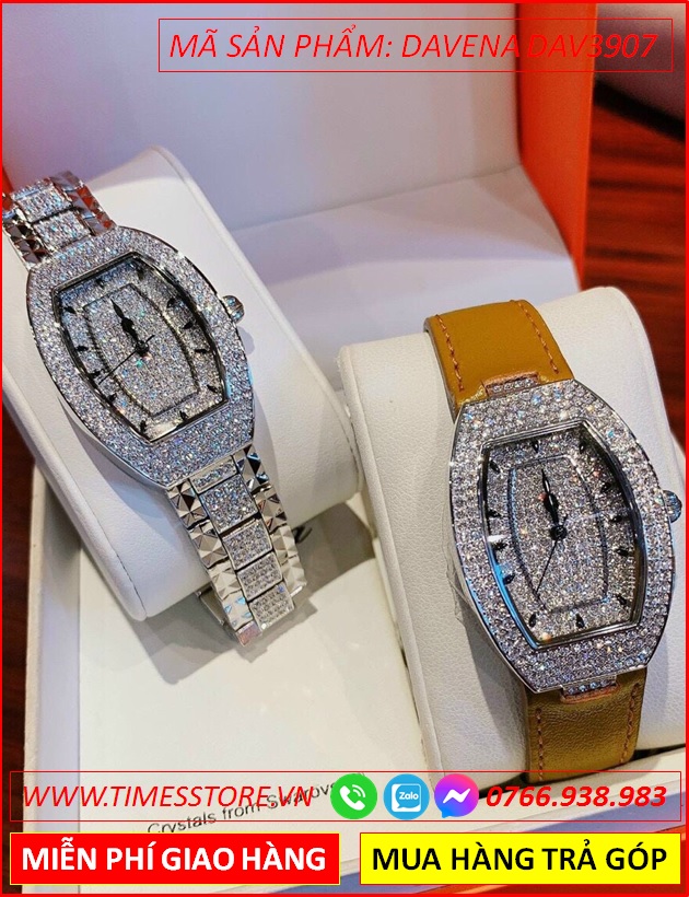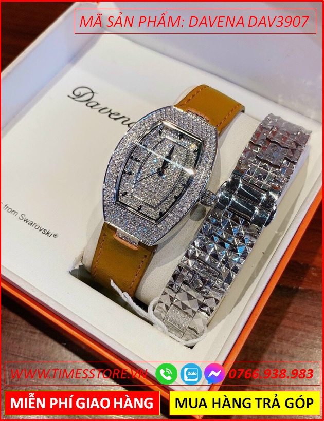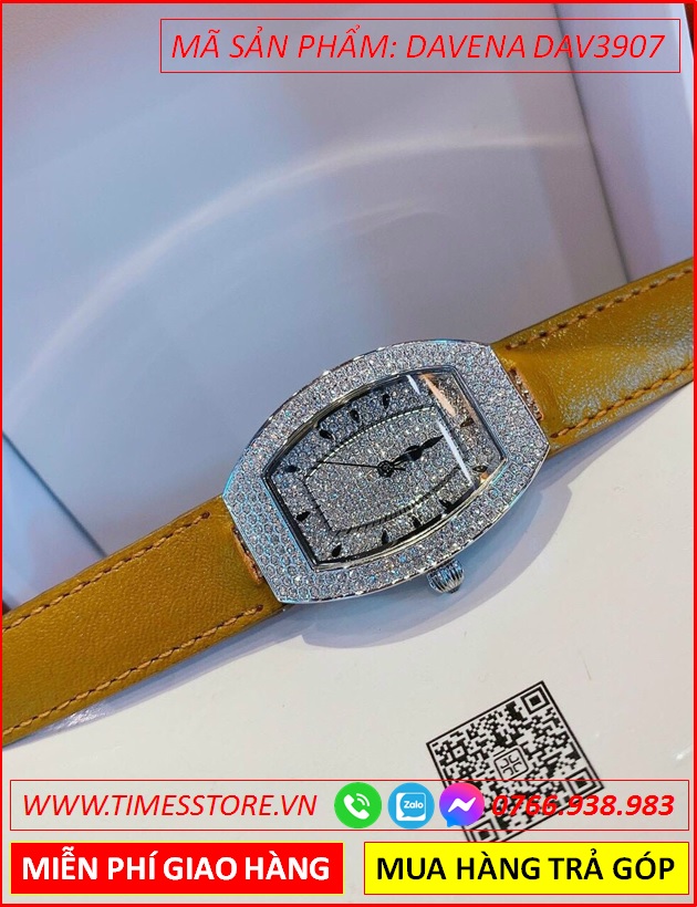 Đồng hồ Nữ Davena Mặt Oval Dây Da Vàng Nâu Full Đá Swarovski