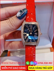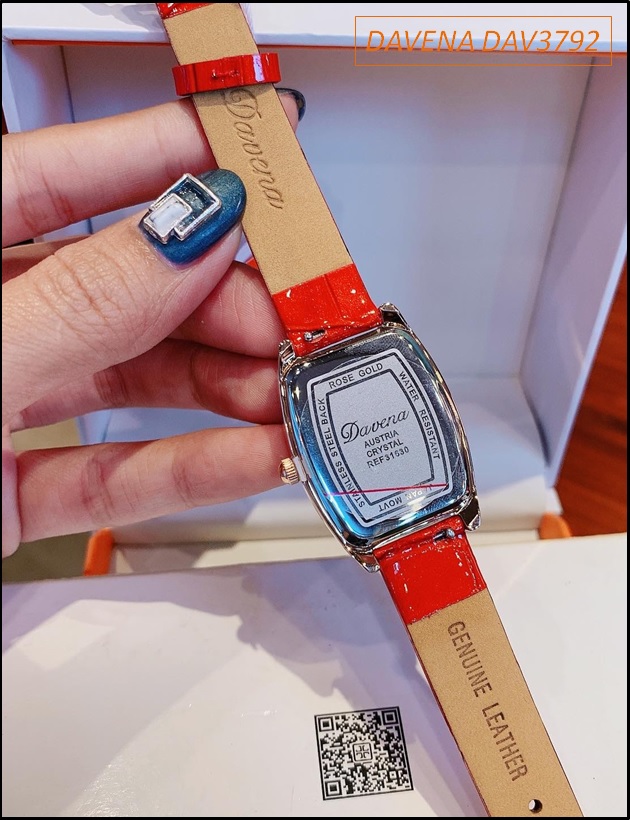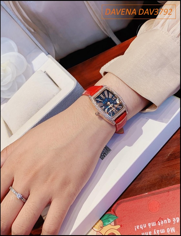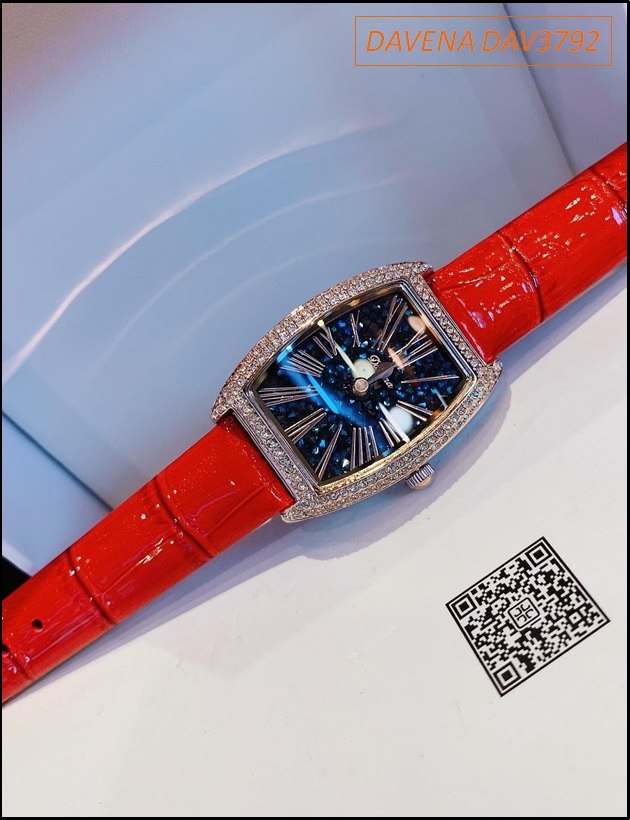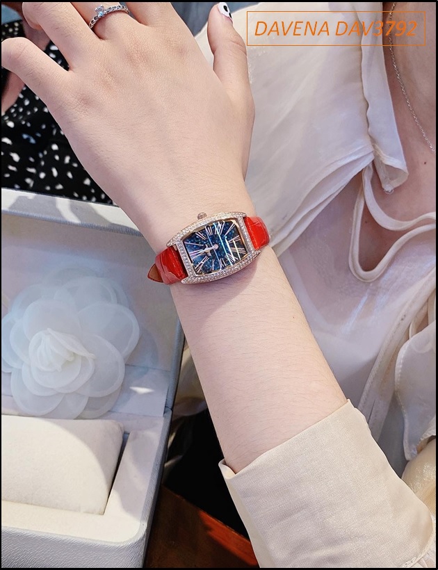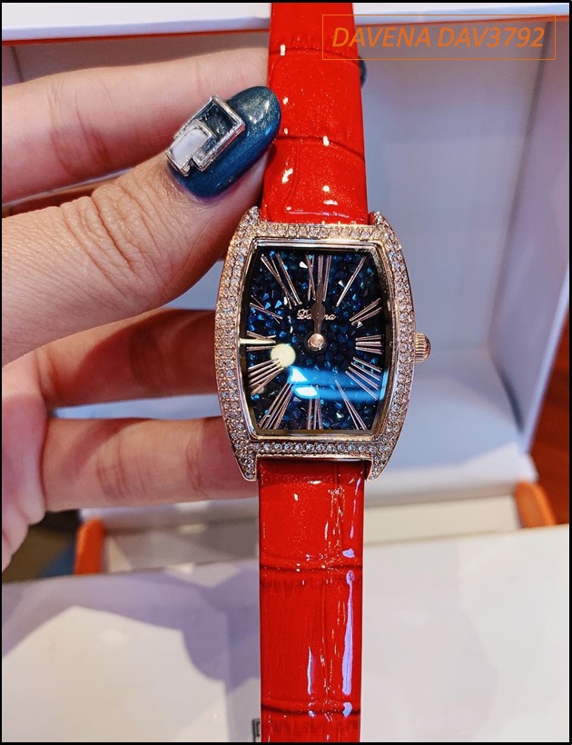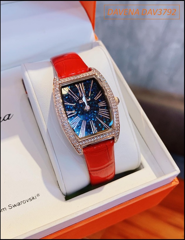 Đồng hồ Nữ Davena Mặt Oval Xanh Dây Da Đỏ Full Đá Swarovski