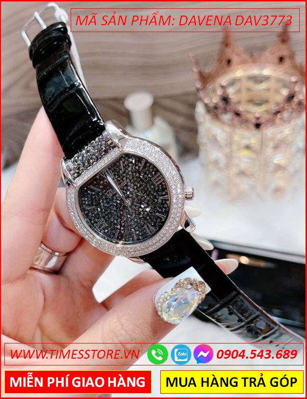 Đồng hồ Nữ Davena Swarovski Dây Da Đen Mặt Bầu Trời Sao