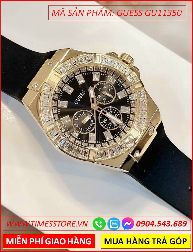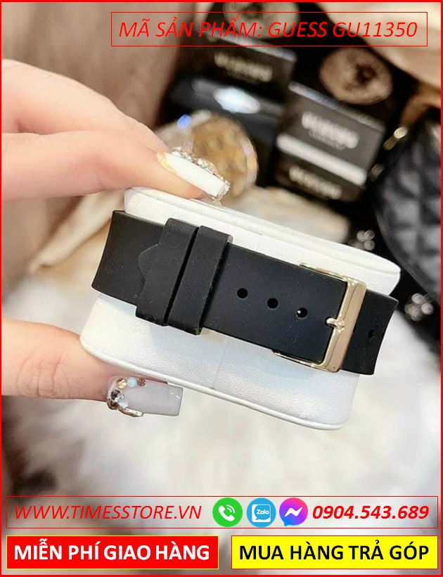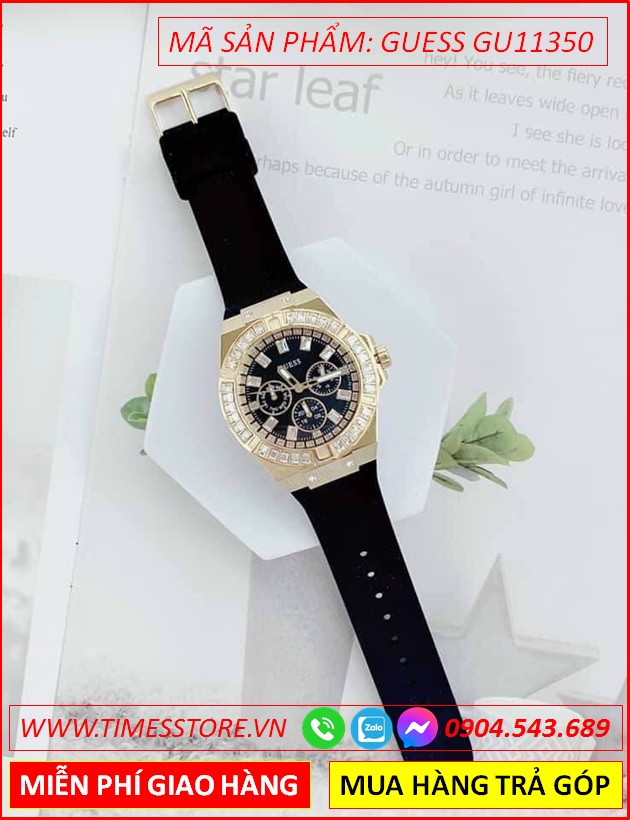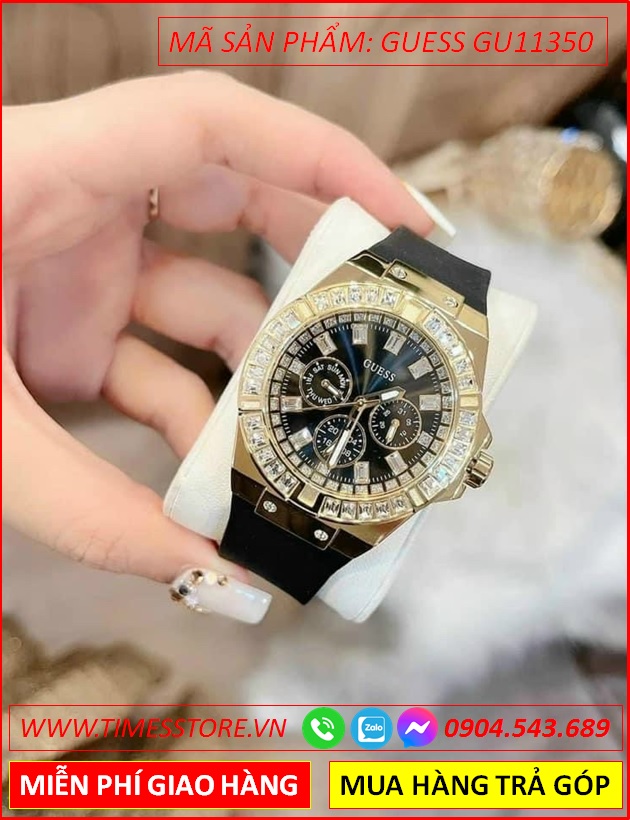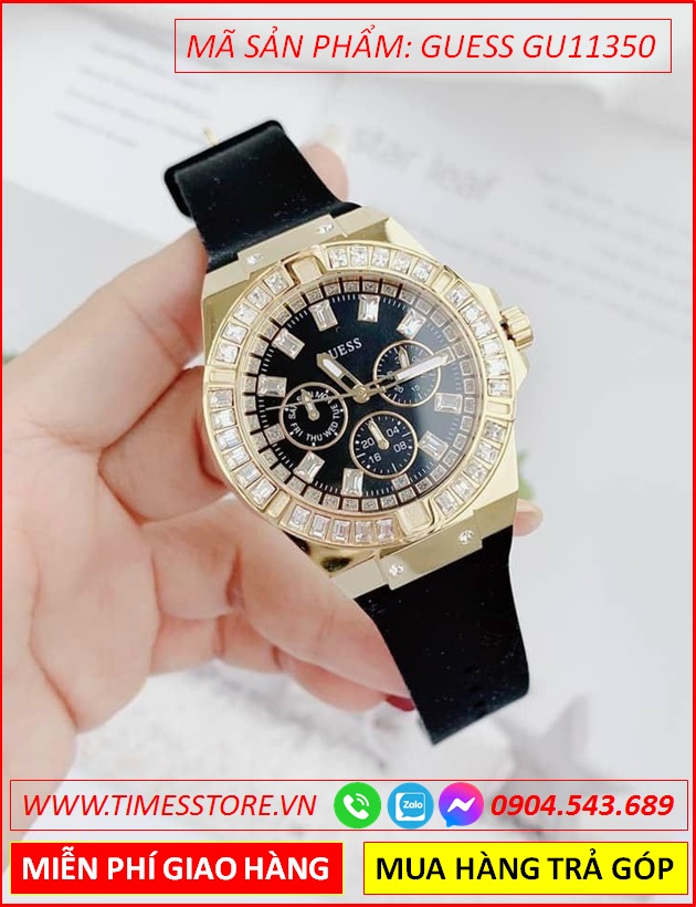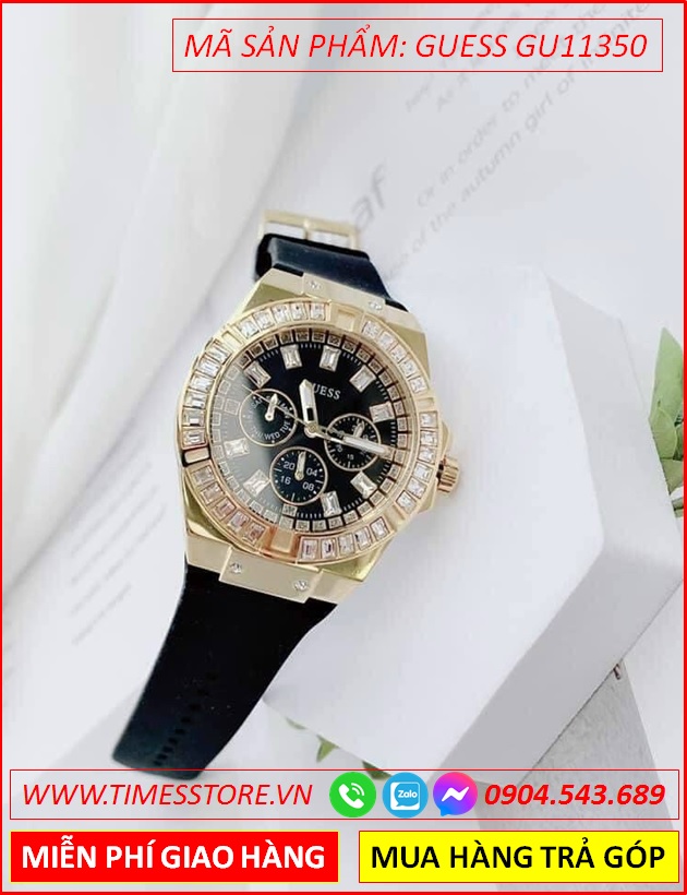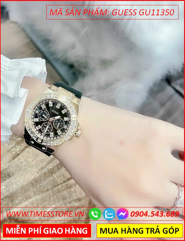 Đồng Hồ Nữ Guess Mặt Tròn Đính Đá Vàng Gold Dây Silicone Đen