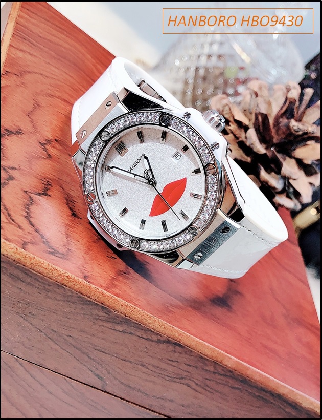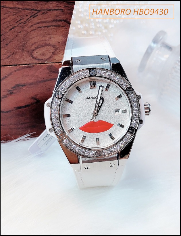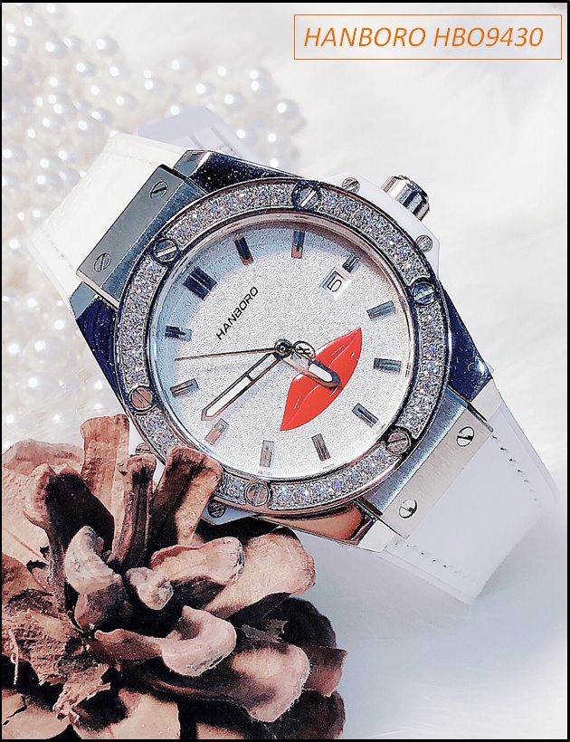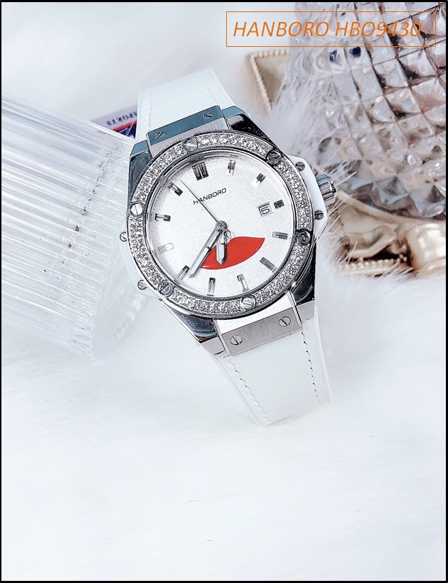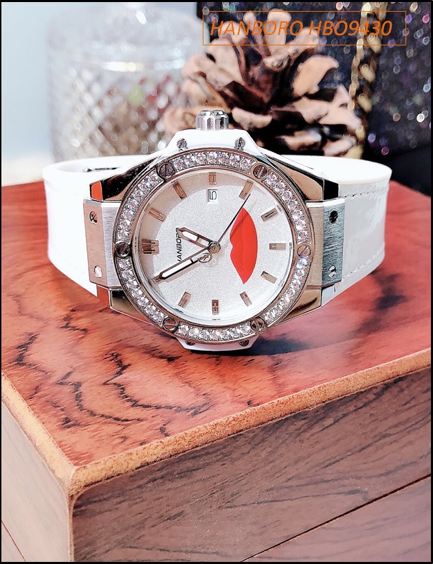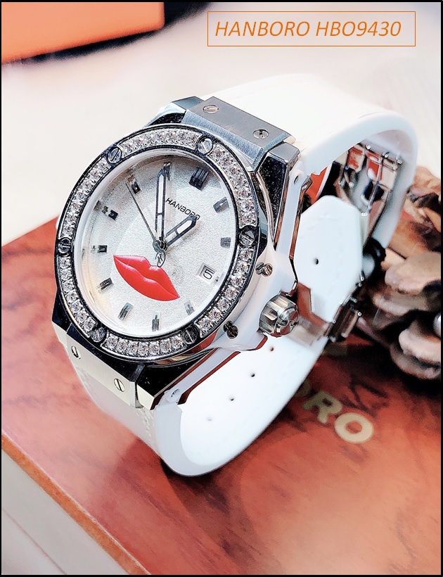Đồng hồ Nữ Hanboro Đôi Môi Đỏ Swarovski Dây Silicone Trắng