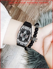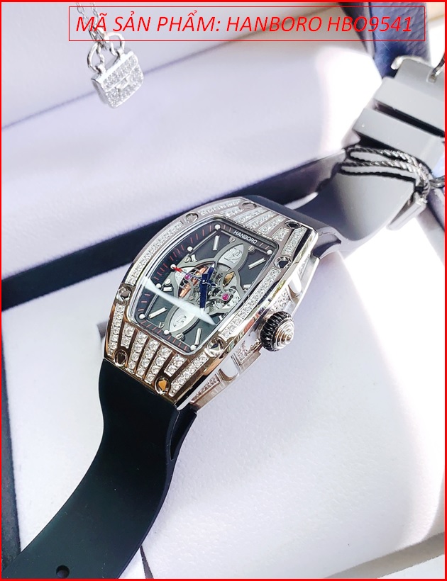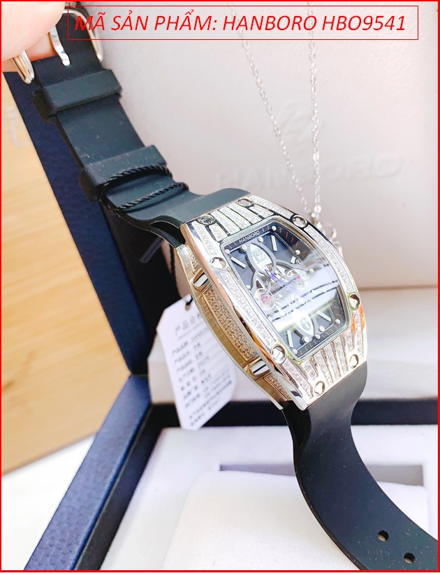 Đồng hồ Nữ Hanboro Mặt Oval Đen Đính Full Đá Dây Cao Su Đen