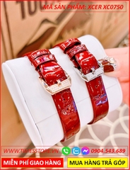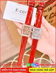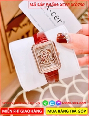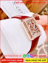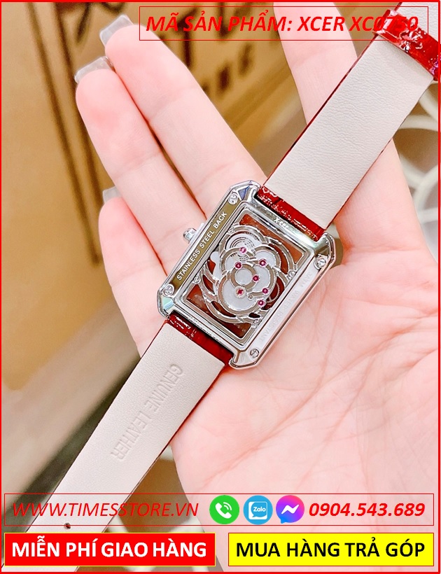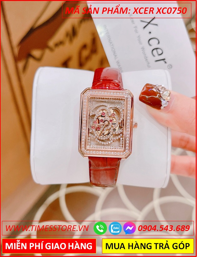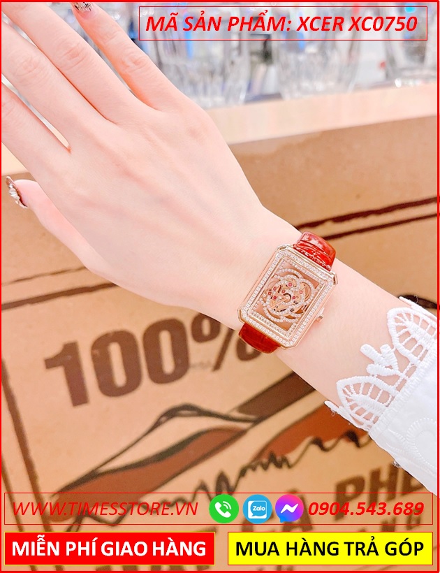 Đồng Hồ Nữ Xcer Mặt Chữ Nhật Rose Gold Lộ Máy Dây Da Đỏ