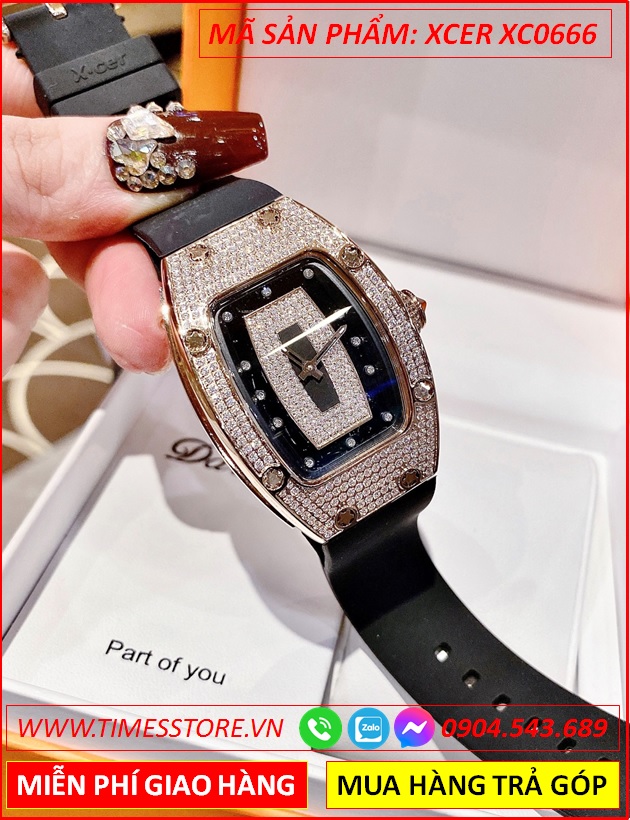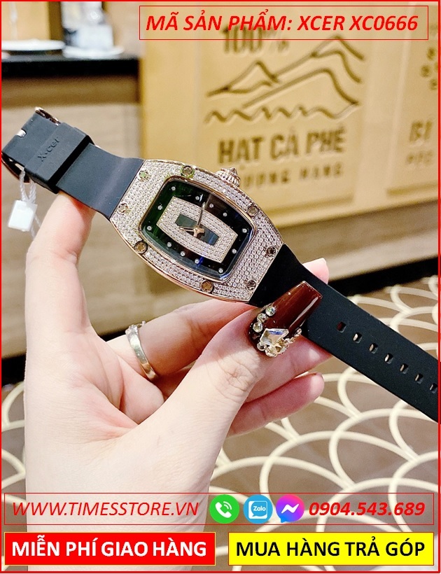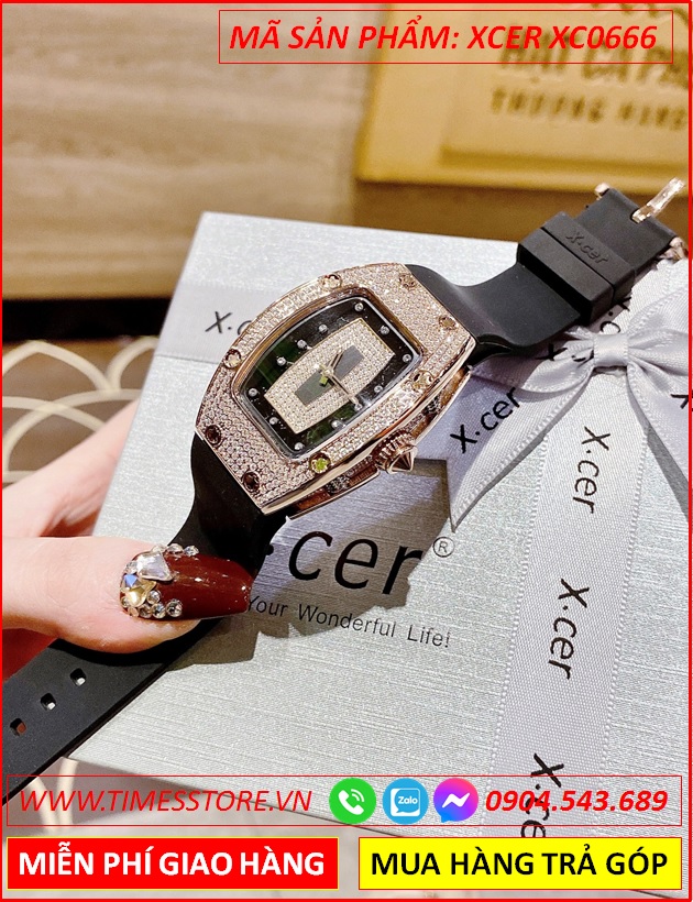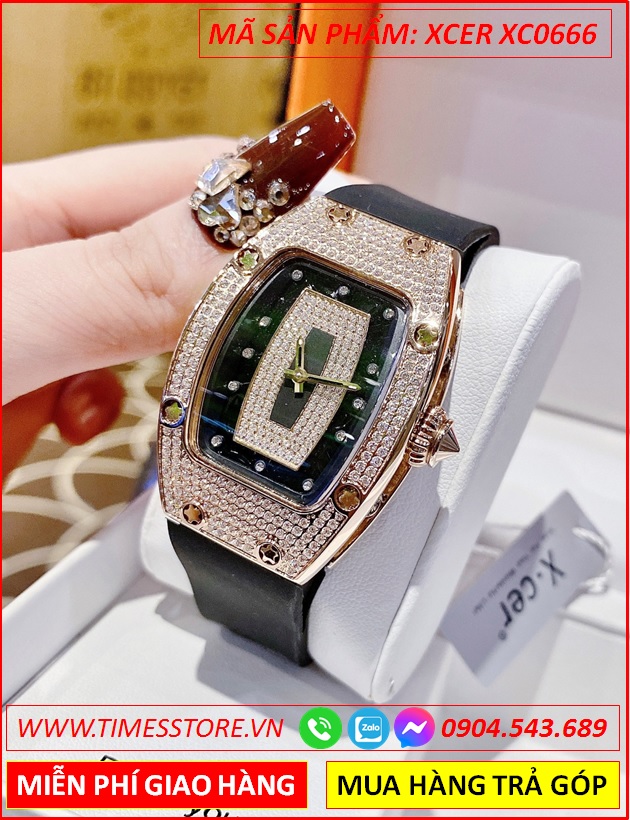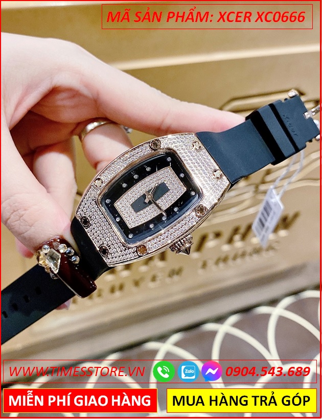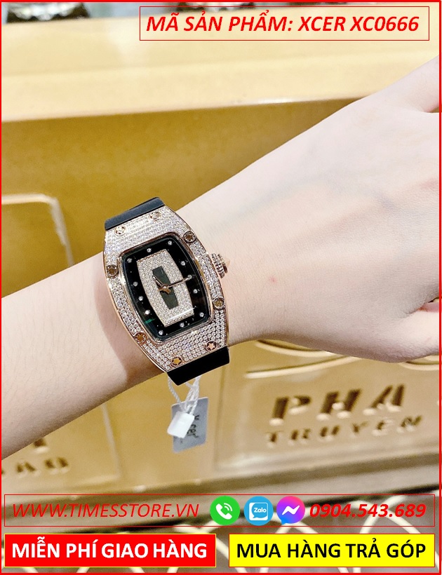 Đồng Hồ Nữ Xcer Mặt Full Đá Rose Gold Dây Silicone Đen
