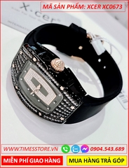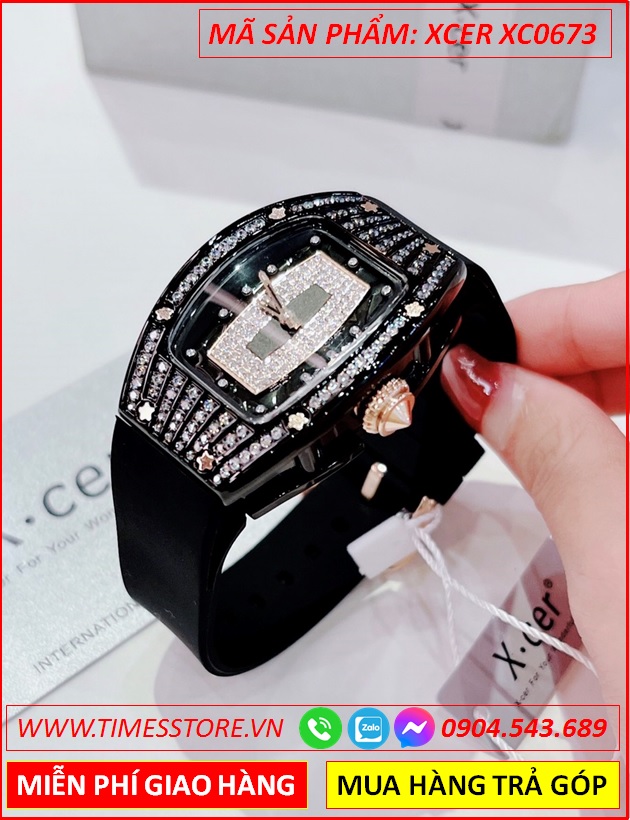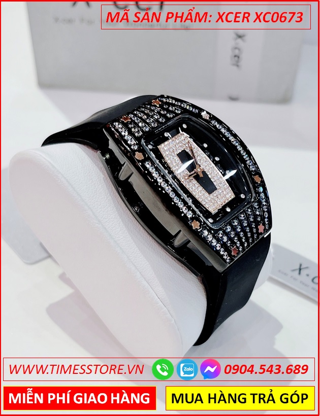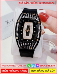 Đồng Hồ Nữ Xcer Mặt Oval Đính Đá Swarovski Dây Silicone Đen