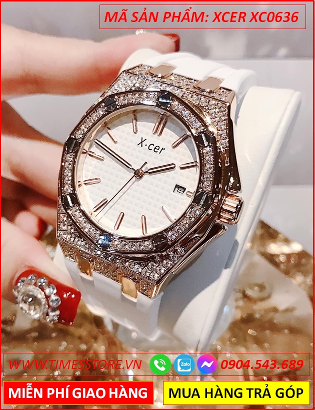 Đồng Hồ Nữ Xcer Tựa Hublot Rose Gold Đính Đá Dây Cao Su Trắng