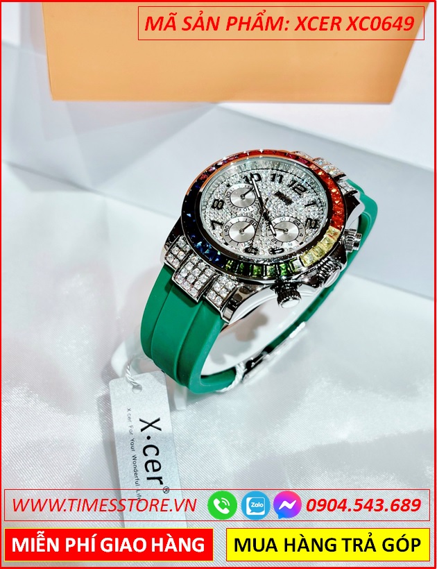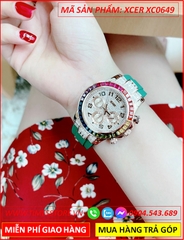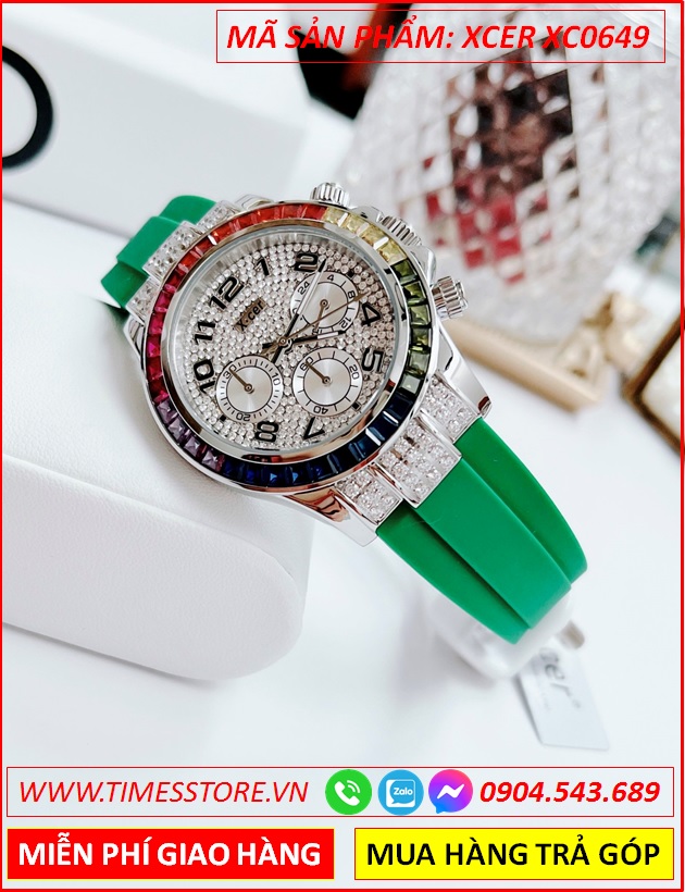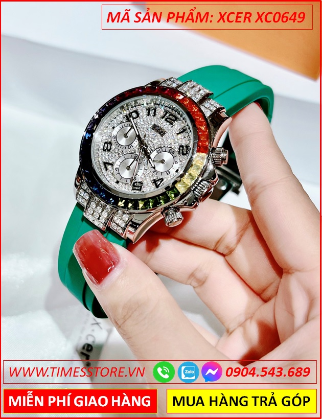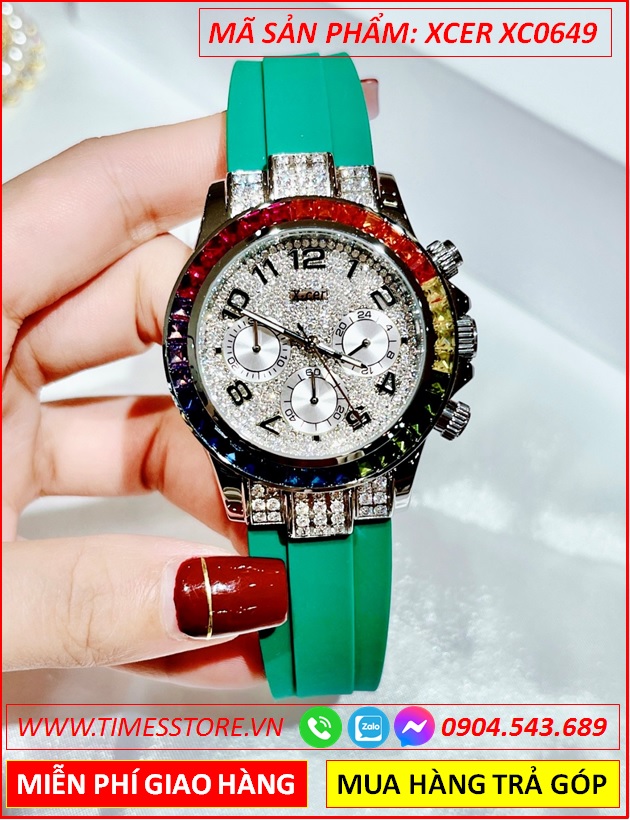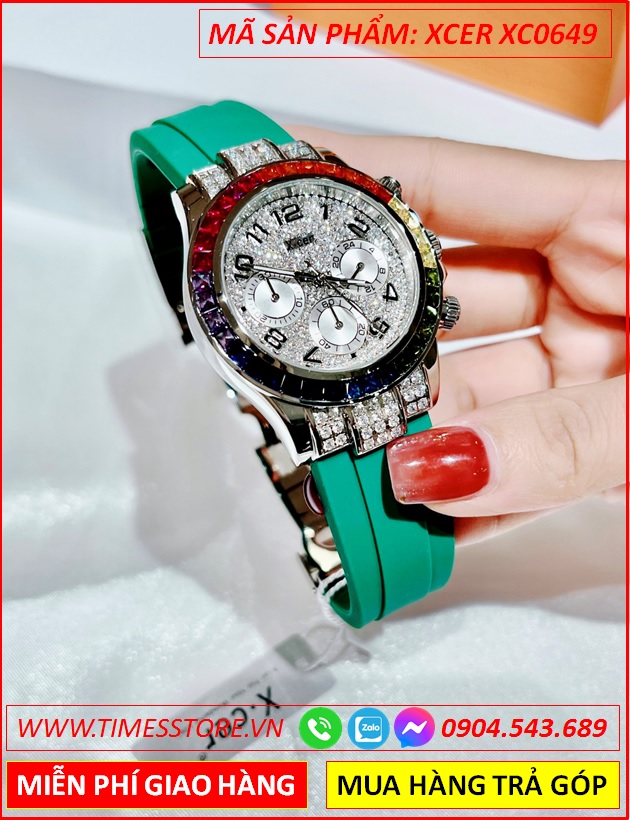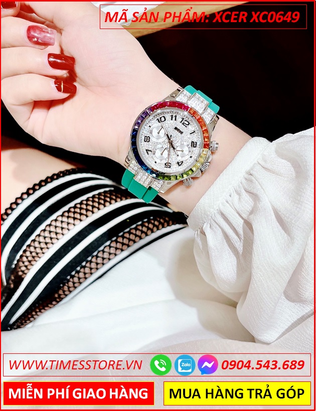 Đồng Hồ Nữ Xcer Tựa Rolex Đính Đá Nhiều Màu Dây Cao Su Xanh
