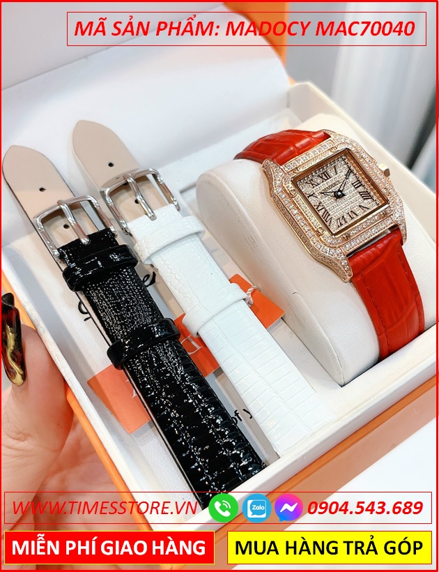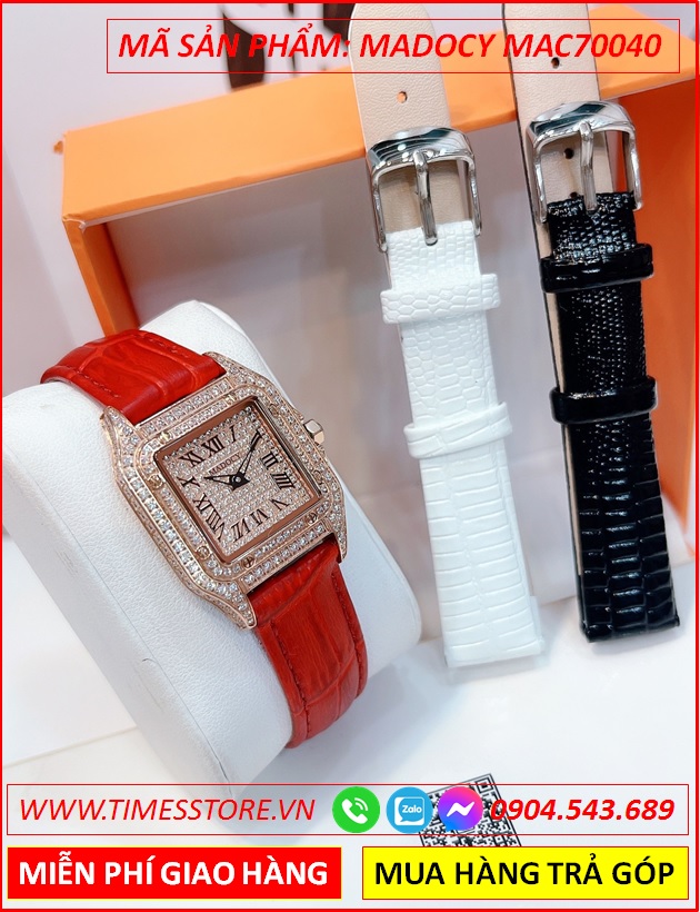 Set Đồng Hồ Madocy Nữ Mặt Vuông Rose Gold Full Đá Dây Da Đỏ