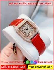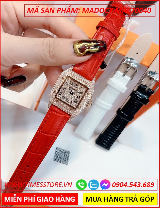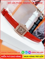 Set Đồng Hồ Madocy Nữ Mặt Vuông Rose Gold Full Đá Dây Da Đỏ (28mm)