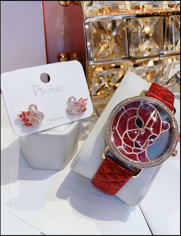 Set Đồng hồ Nữ Davena Mặt Báo Dây Da Đỏ +Bông Tai Swarovski