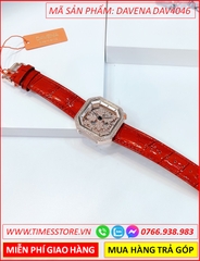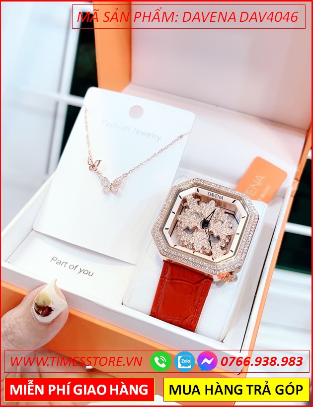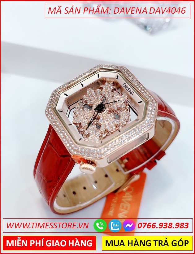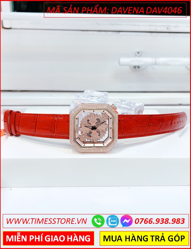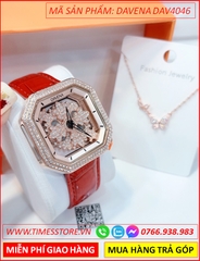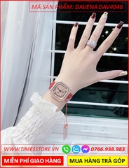 Set Đồng Hồ Nữ Davena Mặt Vuông Cánh Hoa Xoay Dây Da Đỏ