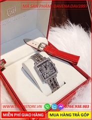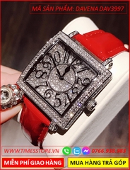 Set Đồng hồ Nữ Davena Mặt Vuông Full Đá Swarovski Dây Da Đỏ