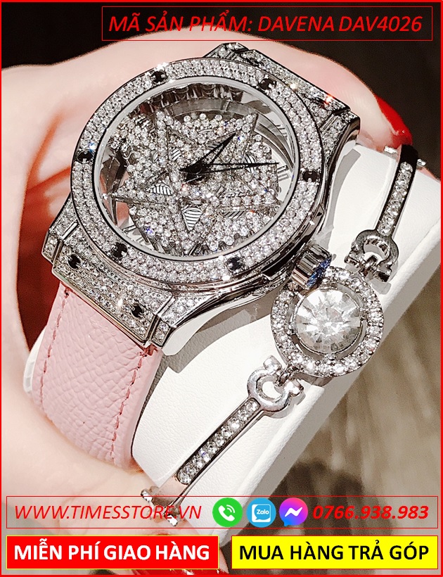 Set Đồng hồ Nữ Davena Mặt Xoay Ngôi Sao Dây Da Vân Màu Hồng