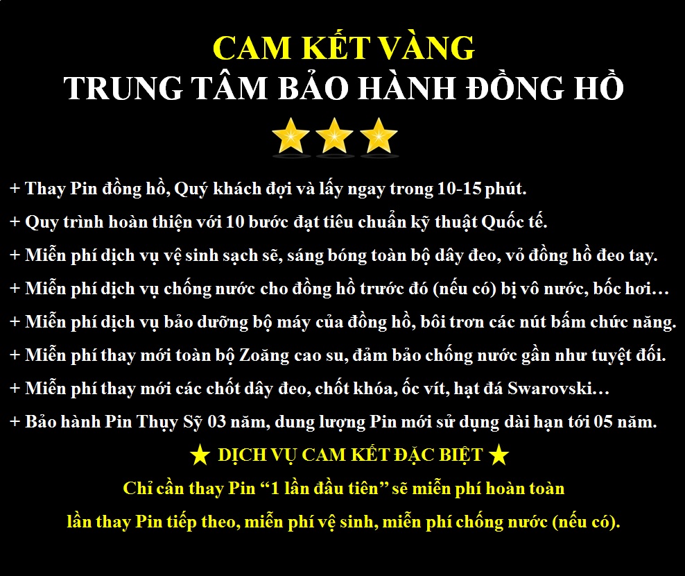 Thay Pin đồng hồ đeo tay với dịch vụ chất lượng và uy tín hàng đầu tại Việt Nam, các dịch vụ ''Cam kết Vàng'' từ Trung tâm bảo hành đồng hồ sẽ mang đến những giá trị tốt nhất mà bạn không thể không hài lòng hơn và phải tới ngay để thay Pin cho đồng hồ của mình thay vì tới nơi khác.
